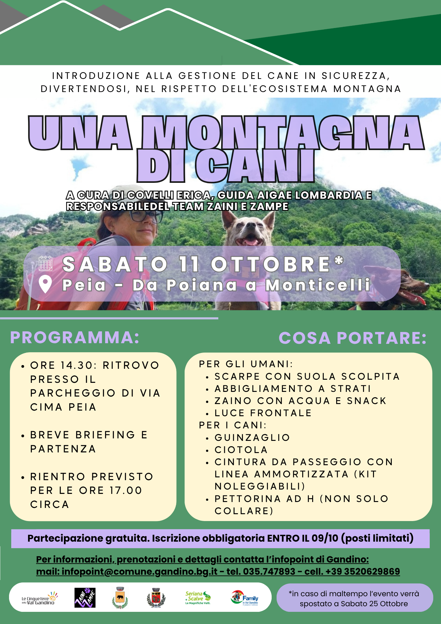 Guidati da Erica Covelli, guida AIGAE Lombardia e responsabile del team Zaini e Zampe, scopriremo come vivere le escursioni in compagnia dei nostri cani in modo sicuro, divertente e rispettoso della natura.