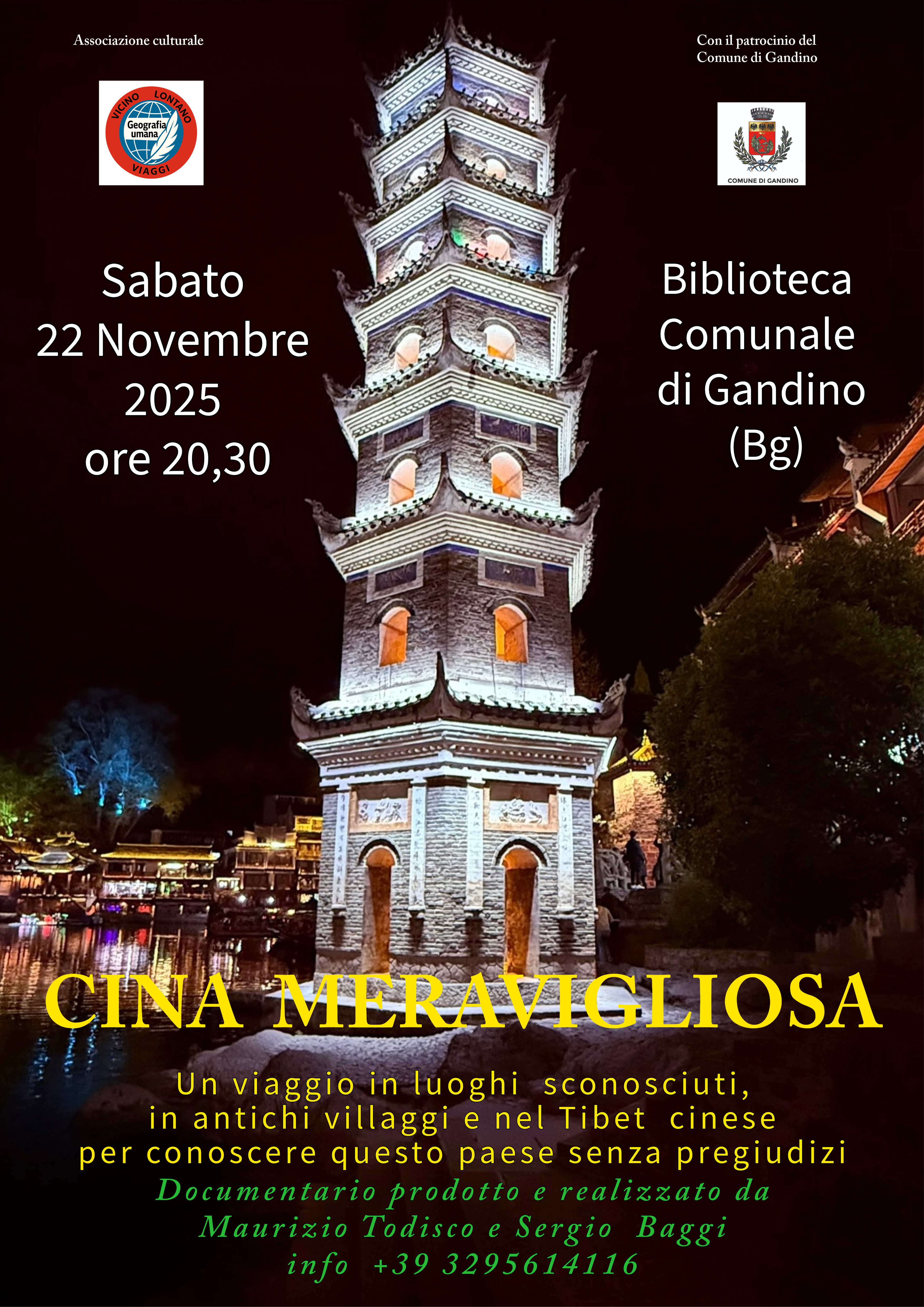 L’appuntamento, organizzato dall’Associazione culturale “Vicino Lontano Viaggi” con il patrocinio del Comune di Gandino, propone la proiezione del documentario “Cina Meravigliosa”, un viaggio visivo e narrativo tra luoghi sorprendenti, antichi villaggi e il Tibet cinese.