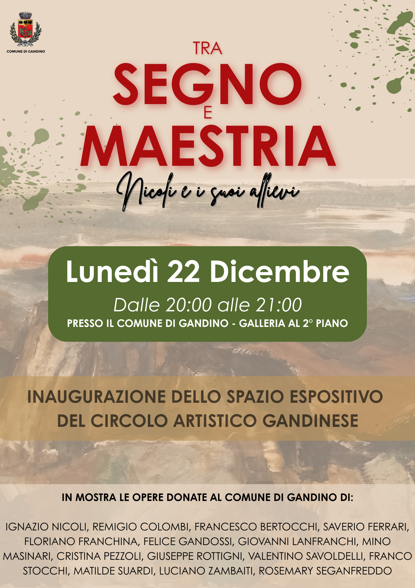 Oggi, quel sogno condiviso trova una nuova casa. Lunedì 22 dicembre, dalle 20:00 alle 21:00, inauguriamo ufficialmente la galleria espositiva al secondo piano del Palazzo Comunale di Gandino: proprio gli spazi dove, mezzo secolo fa, gli artisti si ritrovavano per creare. È qui che prende vita la mostra permanente “Tra segno e maestria – Nicoli e i suoi allievi”, un tributo sentito a chi ha donato bellezza e visione al nostro paese.