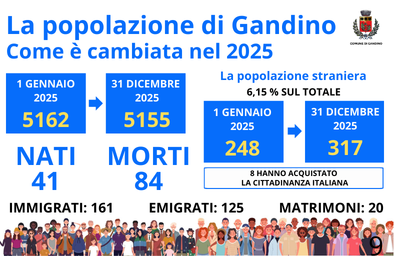 L’analisi del movimento demografico degli ultimi anni evidenzia per il Comune di Gandino un andamento complessivamente equilibrato, sostenuto da un saldo migratorio positivo e da un recente miglioramento del dato sulle nascite. Un risultato che si distingue rispetto alla tendenza prevalente dei Comuni italiani con popolazione compresa tra 5.000 e 10.000 abitanti, dove la diminuzione dei residenti è un fenomeno diffuso.