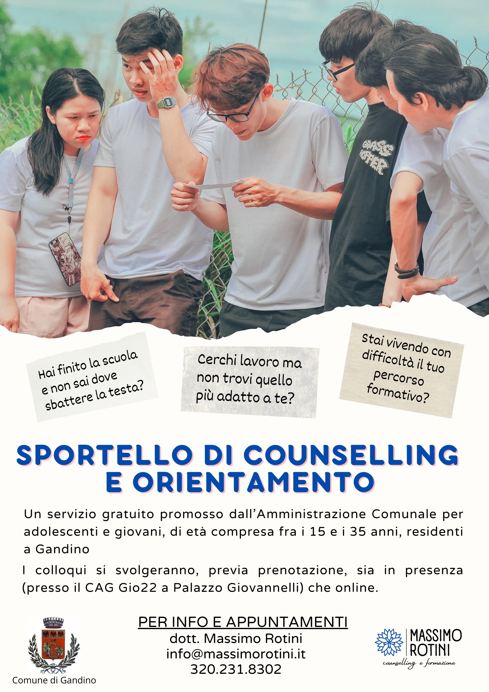 Il Comune di Gandino ti offre un servizio gratuito di counselling e orientamento pensato per adolescenti e giovani dai 15 ai 35 anni.